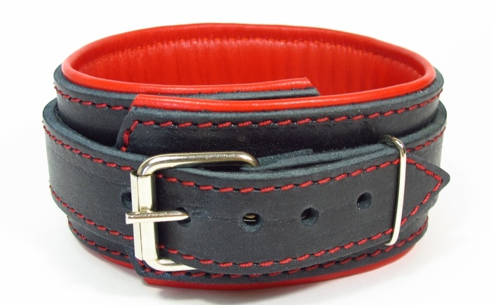 Снаружи ошей­ник выполнен из натуральной толстой ременной кожи черного цвета. Декорирован контрастной грубой строчкой красного цвета. Выглядит провокационно, как на нежной женской шейке, так и на мужской!