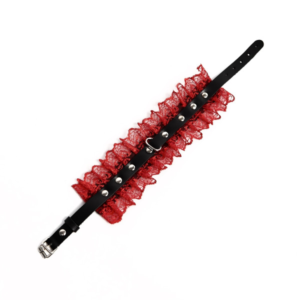 Ошейник выполнен из натуральной кожи и декорирован роскошным кружевом красного цвета! Сочетание кожи и кружева придает образу особенный шарм и выглядит мега провокационно!