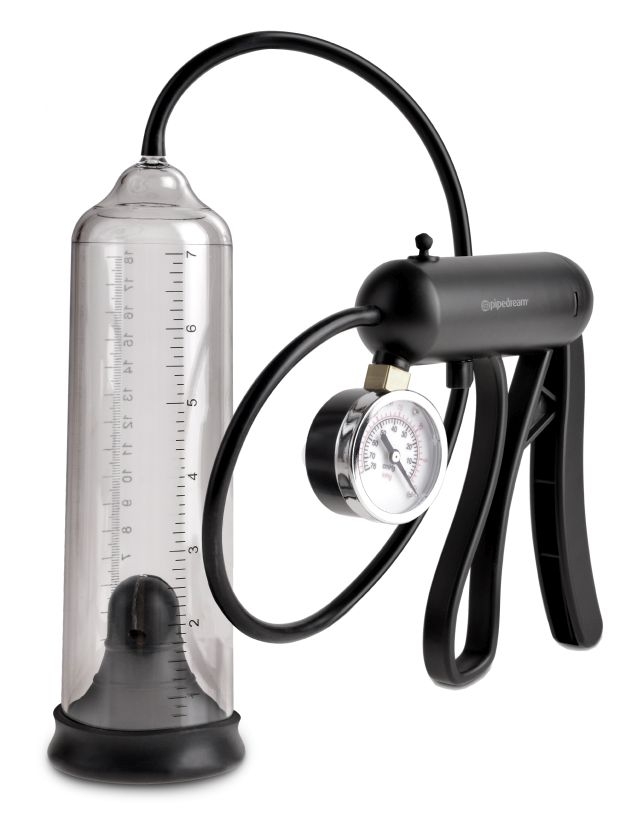 Манометр служит для кон­троля силы дав­ле­ния в колбе, чтобы Вы не пре­вышали во время тре­ни­ро­вок дав­ле­ние на сосуды и не по­вре­дили поло­вой член. Разрядит вакуум внутри колбы мгновенно можно при помощи специального спускового крючка, расположенного на рукояти
